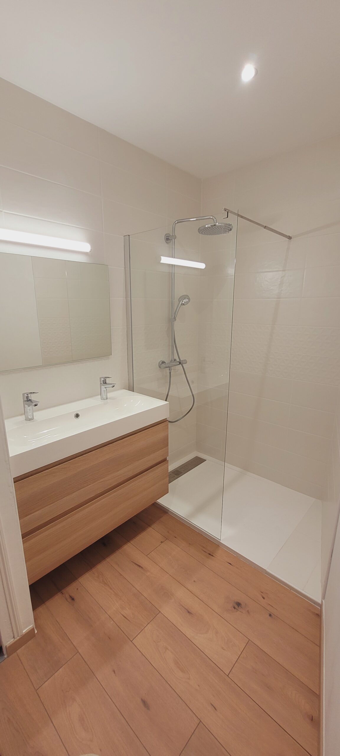 L’appartement est composé d’une pièce de vie de 37m² avec cuisine ouverte aménagée de 12m², un sanitaire, une salle d’eau, un couloir qui dessert trois chambres de 16m² et 18m², une buanderie.